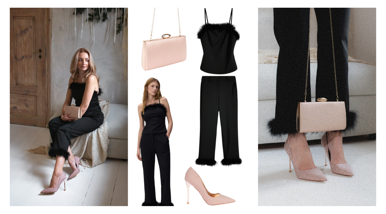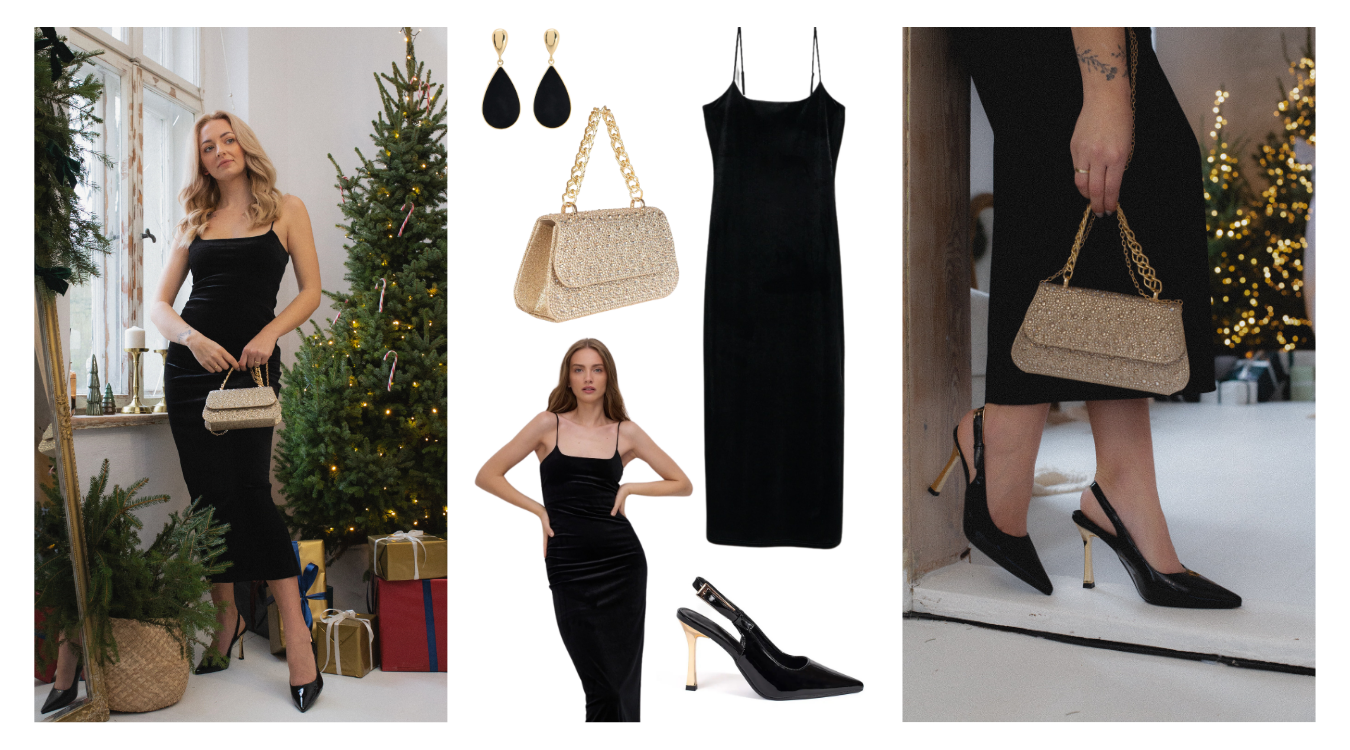 Černé lakované lodičky s otevřenou patou jsou symbolem nadčasové elegance a stylu. Díky decentnímu designu se hodí na večírky i vánoční setkání. Doplňte je malou zlatou kabelkou s flitry, která této kombinaci dodá jedinečný nádech. Abyste tomuto looku dodali jiskru a špetku rafinovanosti, zvolte dlouhé černé šaty na ramínka z hebkého veluru, které krásně zdůrazní postavu. Tuto kombinaci jsme vytvořili pro ženy, které mají rády klasický styl s nádechem elegance.