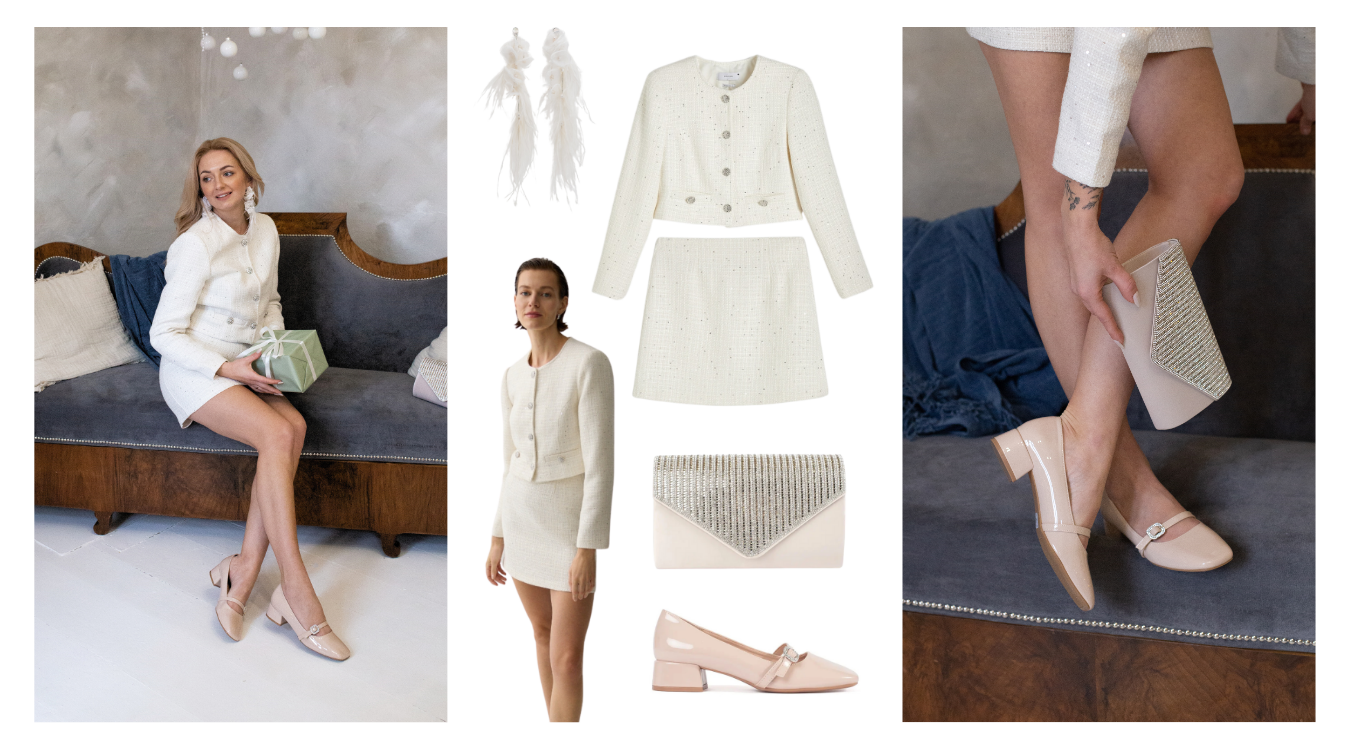 Béžové lodičky na nízkém podpatku představují kombinaci pohodlí a elegance. Díky univerzální barvě se hodí jako doplněk k celé řadě různých stylizací. S čím je tedy můžete kombinovat? Zvolili jsme krémový set z látky typu chanel – krátké sako a midi sukně vypadají módně a stylově. Doplňuje je zlaté psaníčko zdobené krystalky, které outfitu dodává elegantní a ženský ráz. Tato kombinace se hodí na běžné nošení i na vánoční večírky.