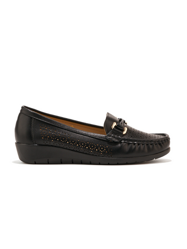 Černé dámské mokasíny na klínku se zlatou ozdobou