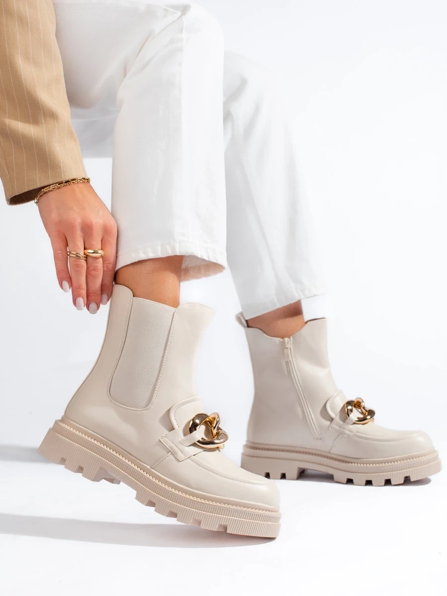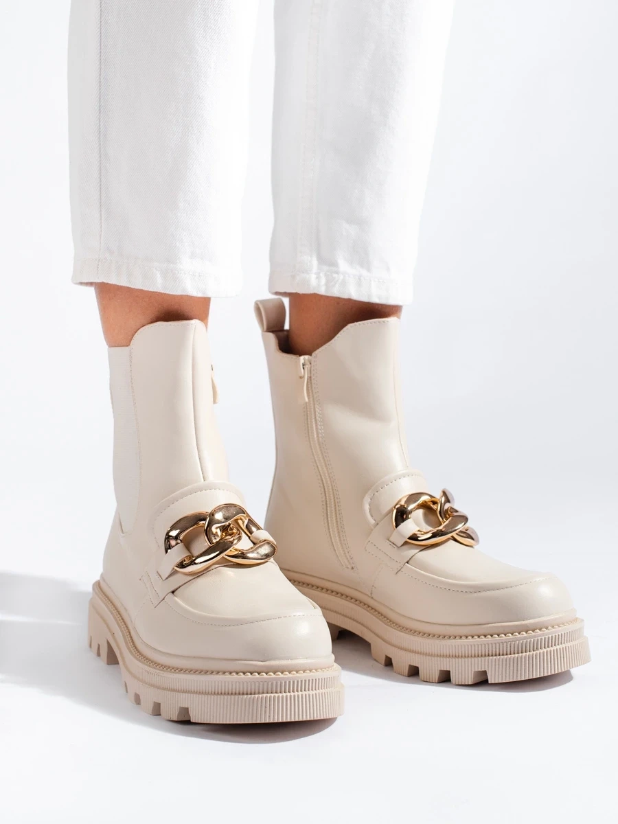 Bežové dámské workery na platformě jsou nezbytností v šatníku každé moderní ženy. Jsou ideální pro každodenní nošení, procházky městem nebo pro neformální setkání s přáteli. Kombinujte je s džínami, legíny nebo rovnými kalhotami pro dokonalý outfit. Navíc, ozdobný řetízek dodává těmto botám jedinečný vzhled, který upoutá pozornost.