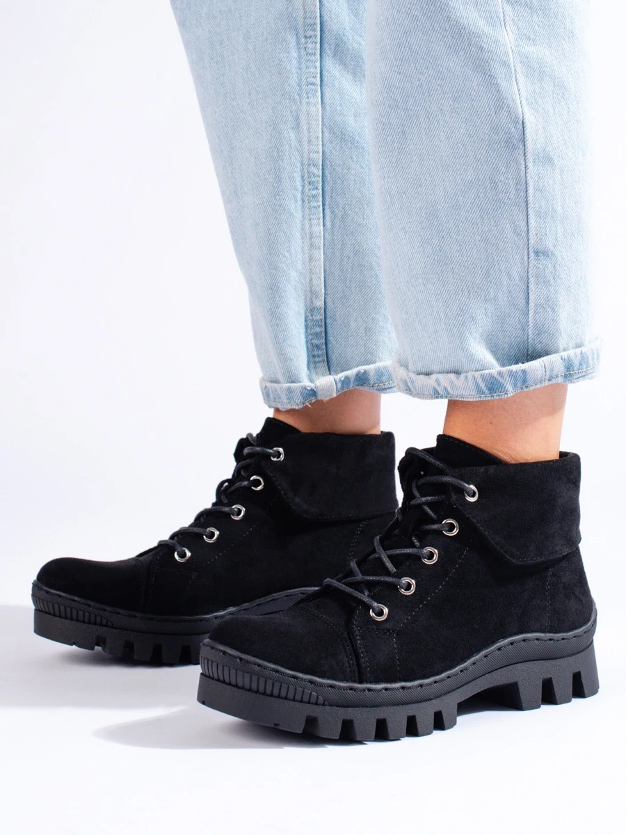 Tyto traperky jsou vyrobeny z kvalitní ekologické kůže, která napodobuje zámš. Jejich elegantní černá barva a detaily na povrchu dodávají botám jedinečný vzhled. Pevné šněrování zaručuje perfektní přizpůsobení každému tvaru nohy.