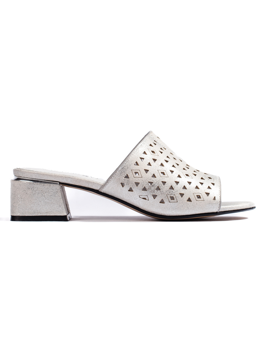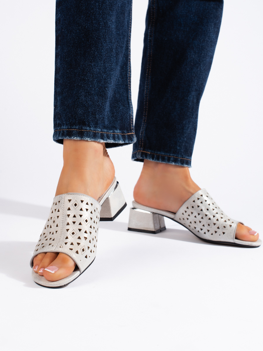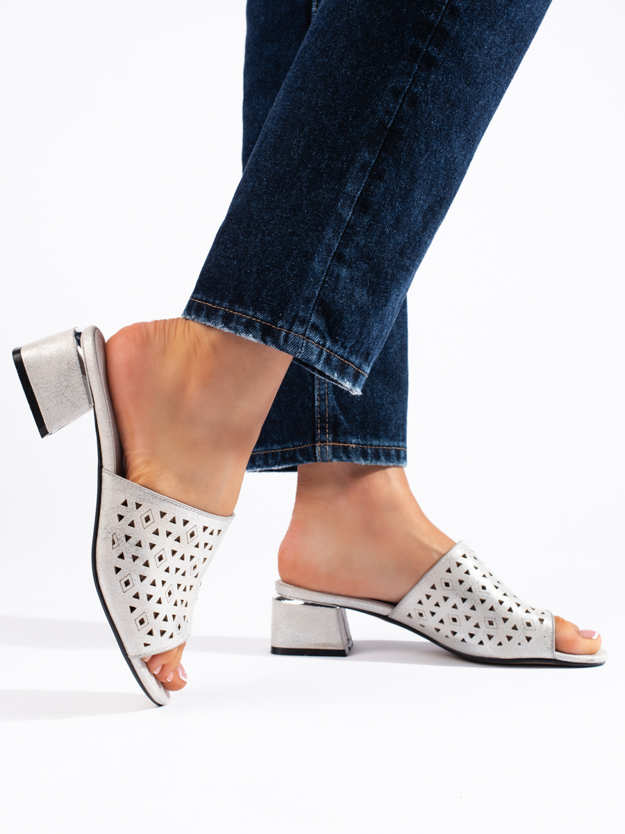 Ažurové stříbrné pantofle na nízkém sloupkovém podpatku