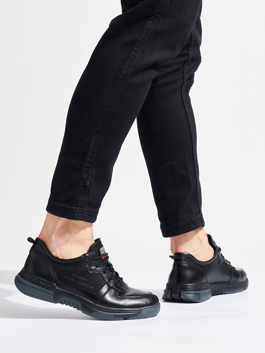Naše černé sportovní boty jsou vyrobeny z 100% imitace kůže, což je zárukou jejich dlouhé životnosti a odolnosti. Přestože je materiál umělý, vypadá velmi přirozeně a je příjemný na dotek. Podešev z odolného syntetického materiálu zaručuje vysokou odolnost proti opotřebení a zajišťuje bezpečný krok na jakémkoliv povrchu.