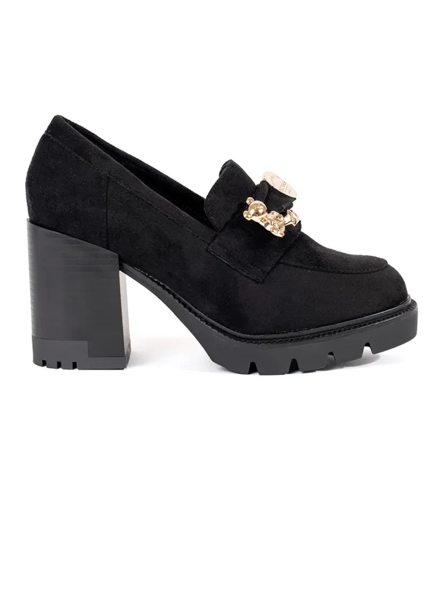 Objete svět s elegancí a pohodlím v našich nových černých dámských polobotkách. Tento moderní kousek je vyroben z vysoce kvalitního ekologického semišu a zdobený kovovými detaily, které přidají jiskru do každého vašeho kroku.