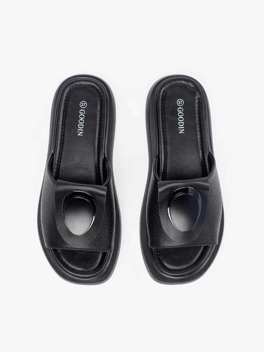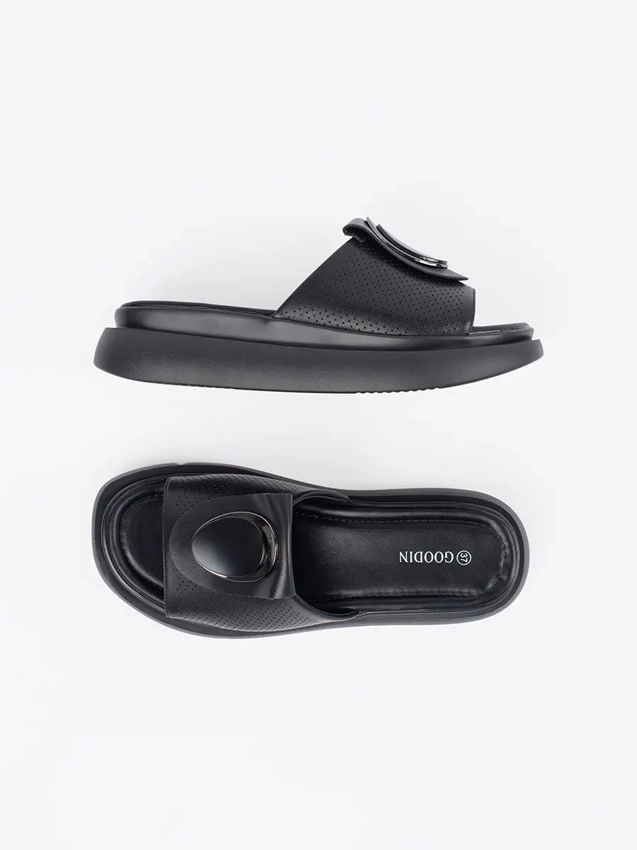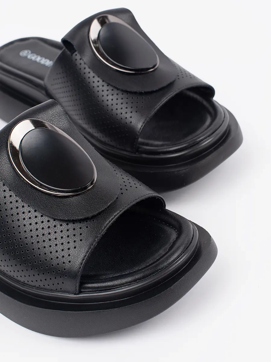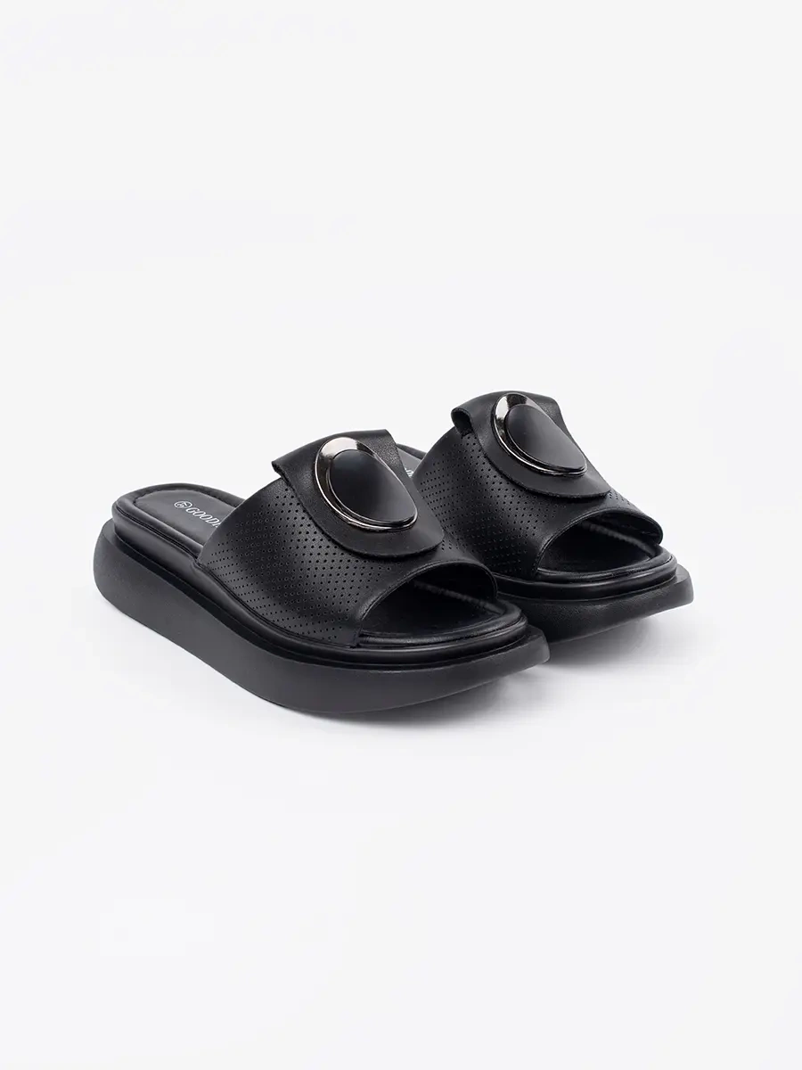 Naše černé klapky na platformě jsou skvělým doplňkem do vaší šatní skříně. Vyrobeny ze 100% přírodní kůže, poskytují vám luxusní pocit s každým krokem. Jejich klouzavý design a otevřený nosník zajišťují maximální pohodlí během celého dne.