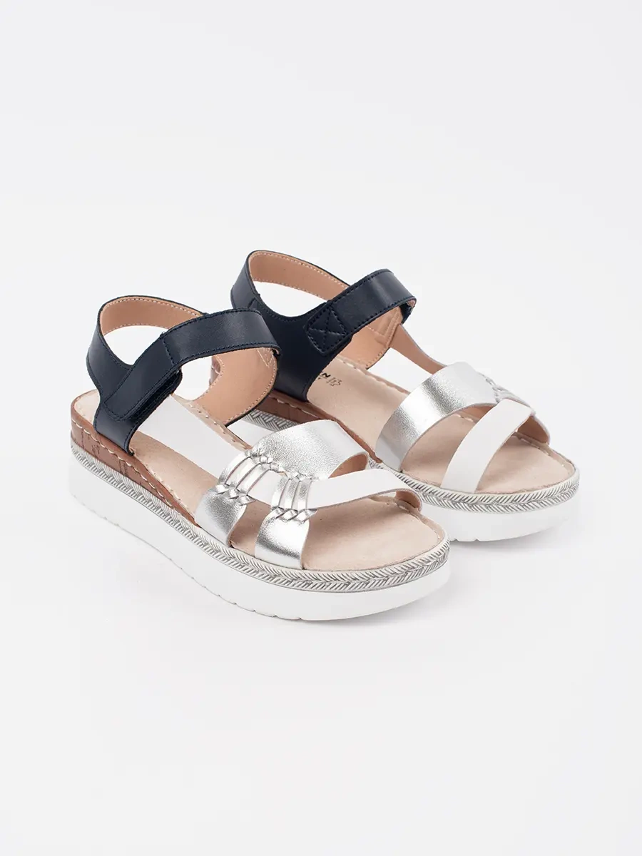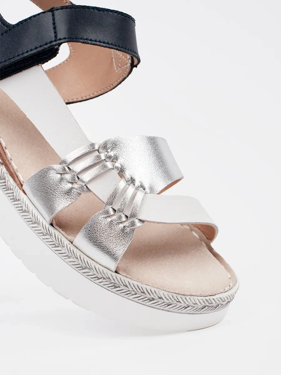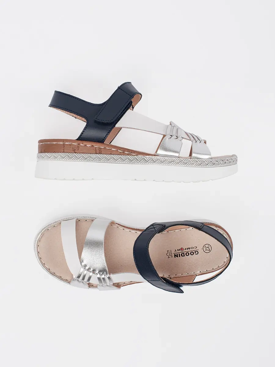 Bílo-tmavě modré sandály na platformě s metalickým zdobením