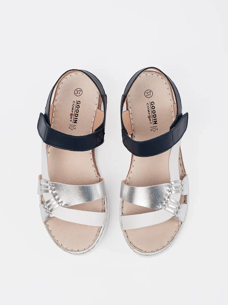 Tyto sandály jsou vyrobeny z 100% přírodní kůže, což zaručuje jejich dlouhou životnost a vysoký komfort při nošení. Kovové zdobení dodává sandálům jedinečný a moderní vzhled, který upoutá pozornost na první pohled. Bílo-modrá kombinace barev pak umožňuje snadné kombinování s širokou škálou outfitů.