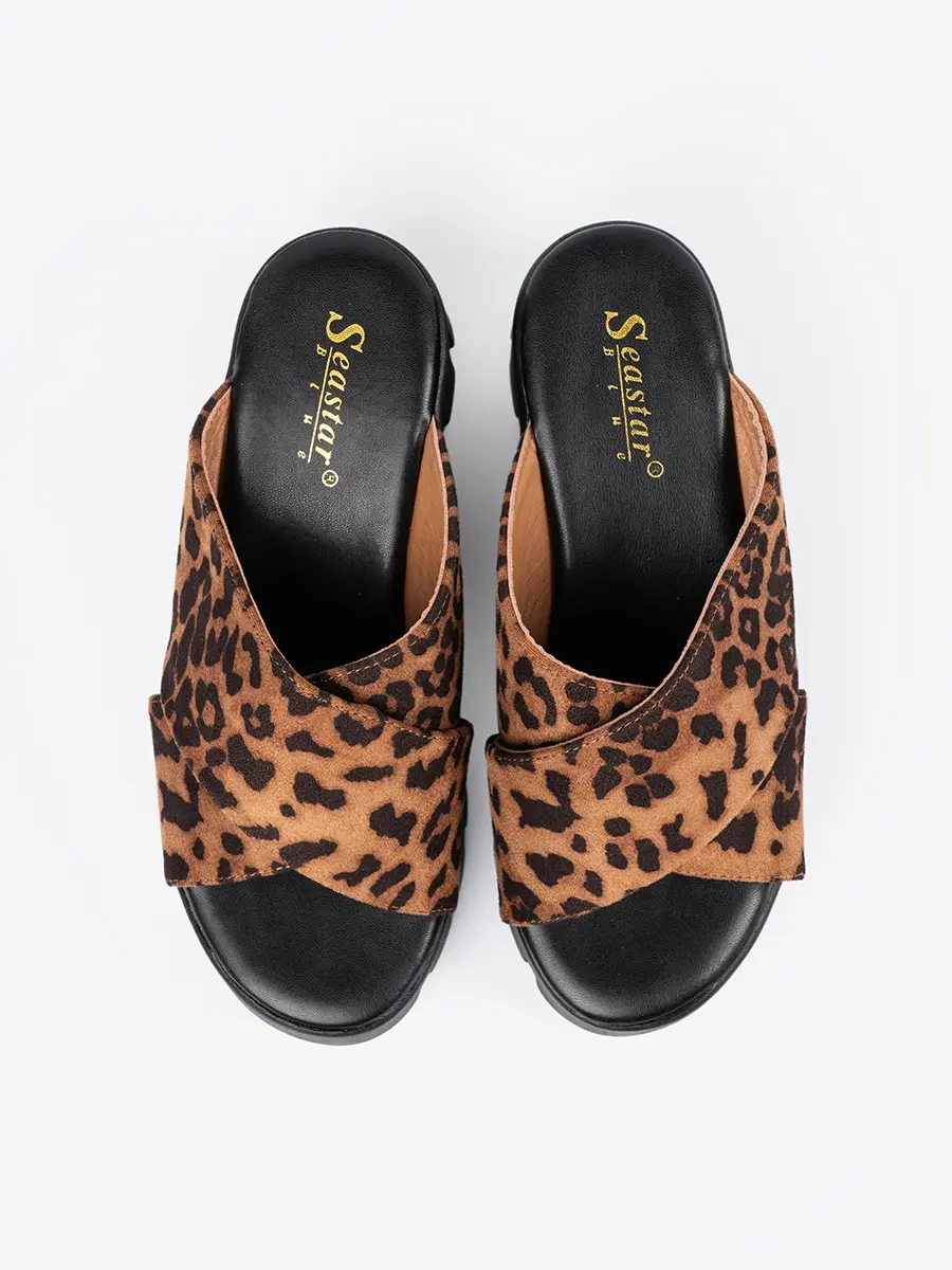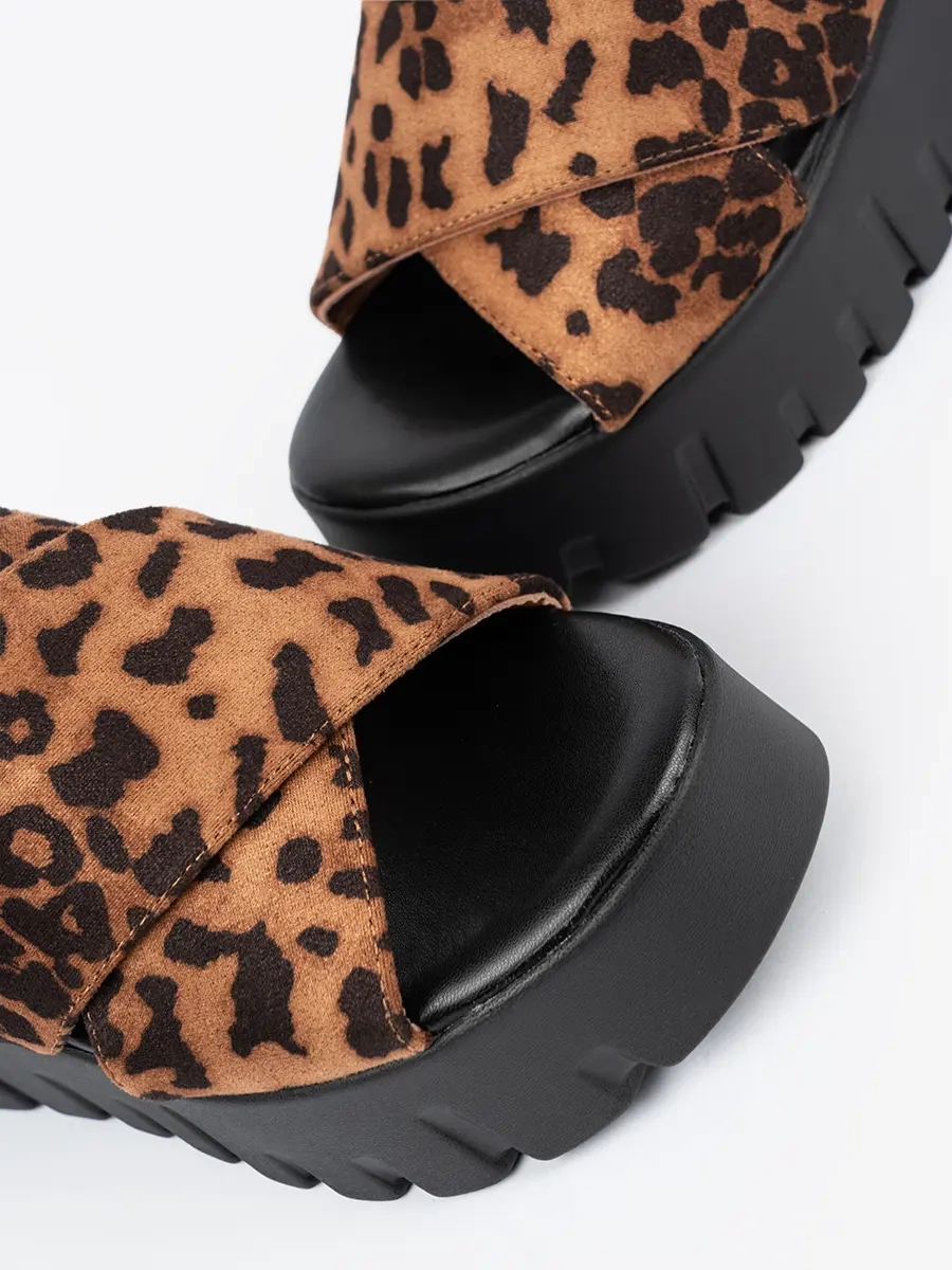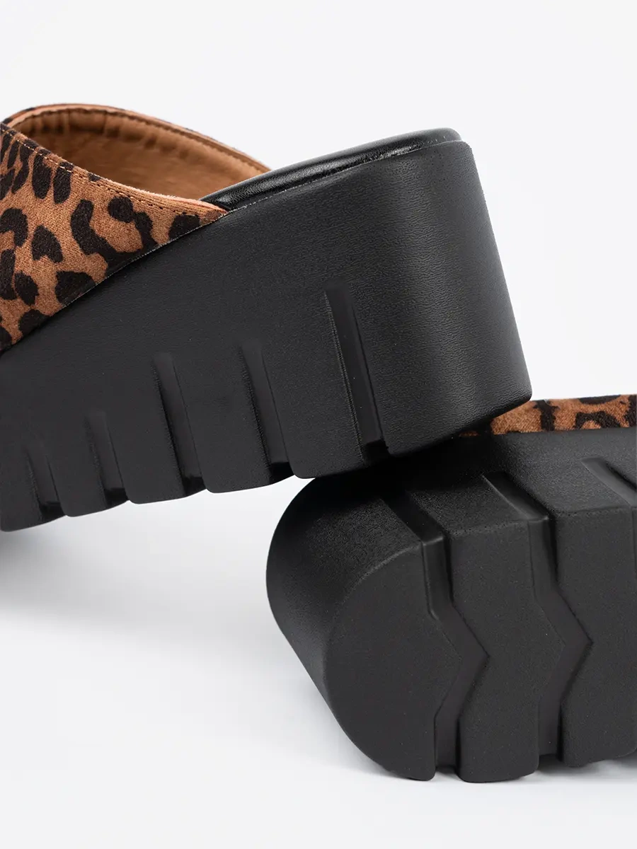 Zamszowe klapki damskie na koturnie w panterkę – zářte v každodenním stylu
