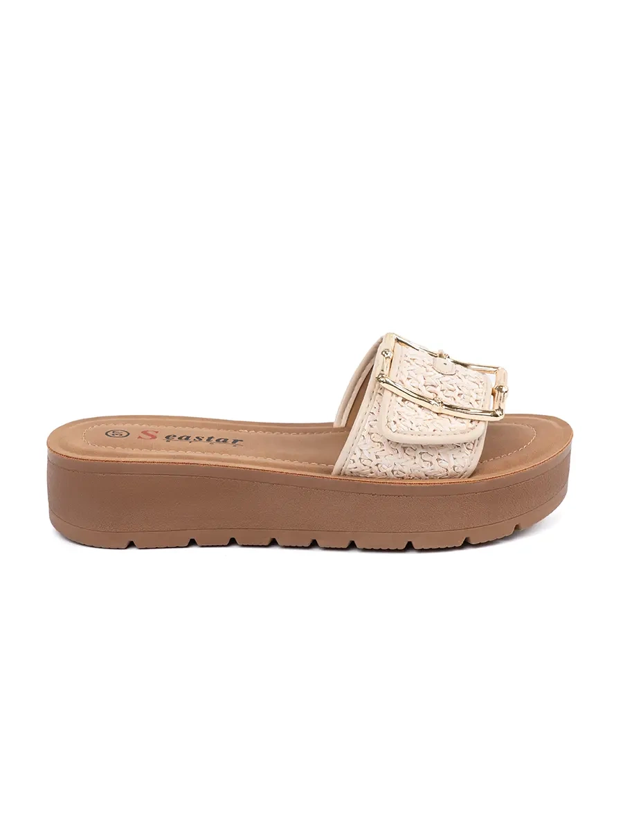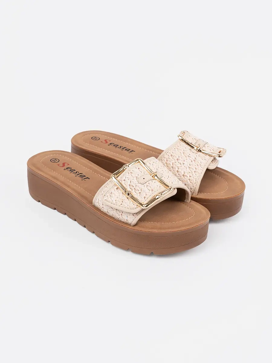 Naše dámské klapky zdobené zlatou klamrou jsou vytvořeny pro moderní ženy, které oceňují eleganci a pohodlí. Jsou vyrobeny z vysoce kvalitního umělého materiálu, který napodobuje skóru, takže nejenže vypadají luxusně, ale také jsou odolné. Světle béžová barva jim dodává svěží a letní vzhled, který se hodí k mnoha outfitům.