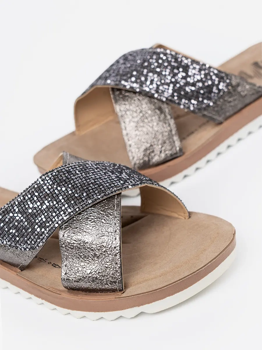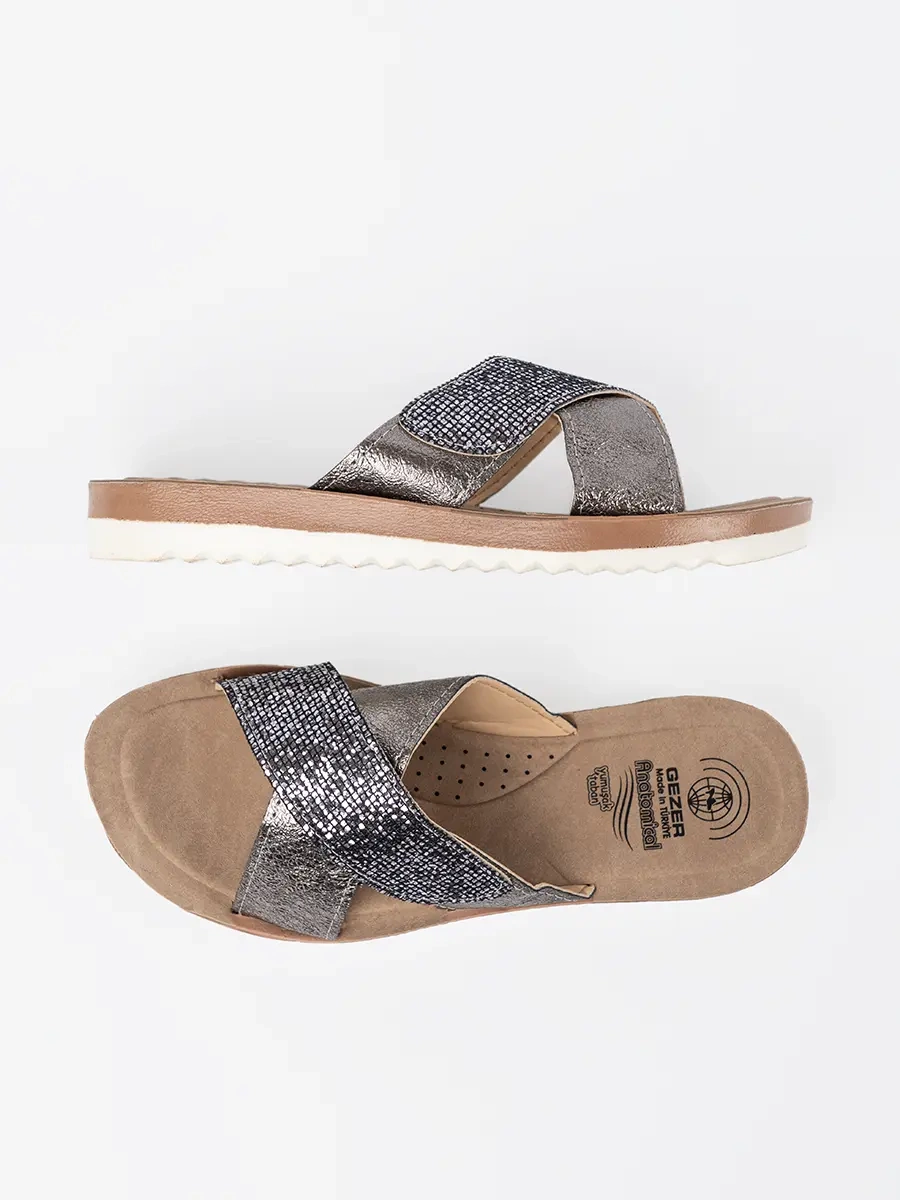 Představujeme Vám naše nové ženské klapky v metalické barvě s bílou podrážkou. Tento model spojuje eleganci, moderní design a pohodlí, a tak se stává ideální volbou pro každodenní nošení.