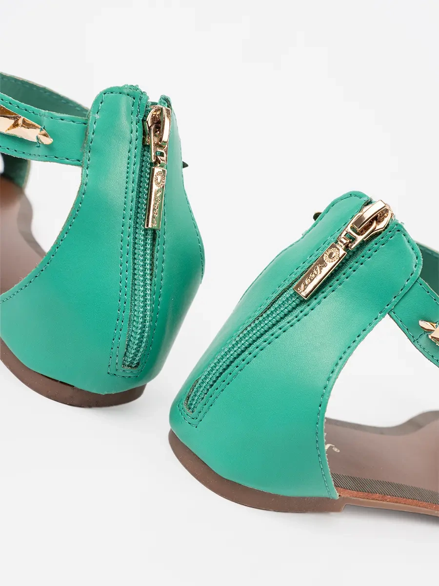 Zelené sandálky s páskem na kotníku a zlatou ozdobou