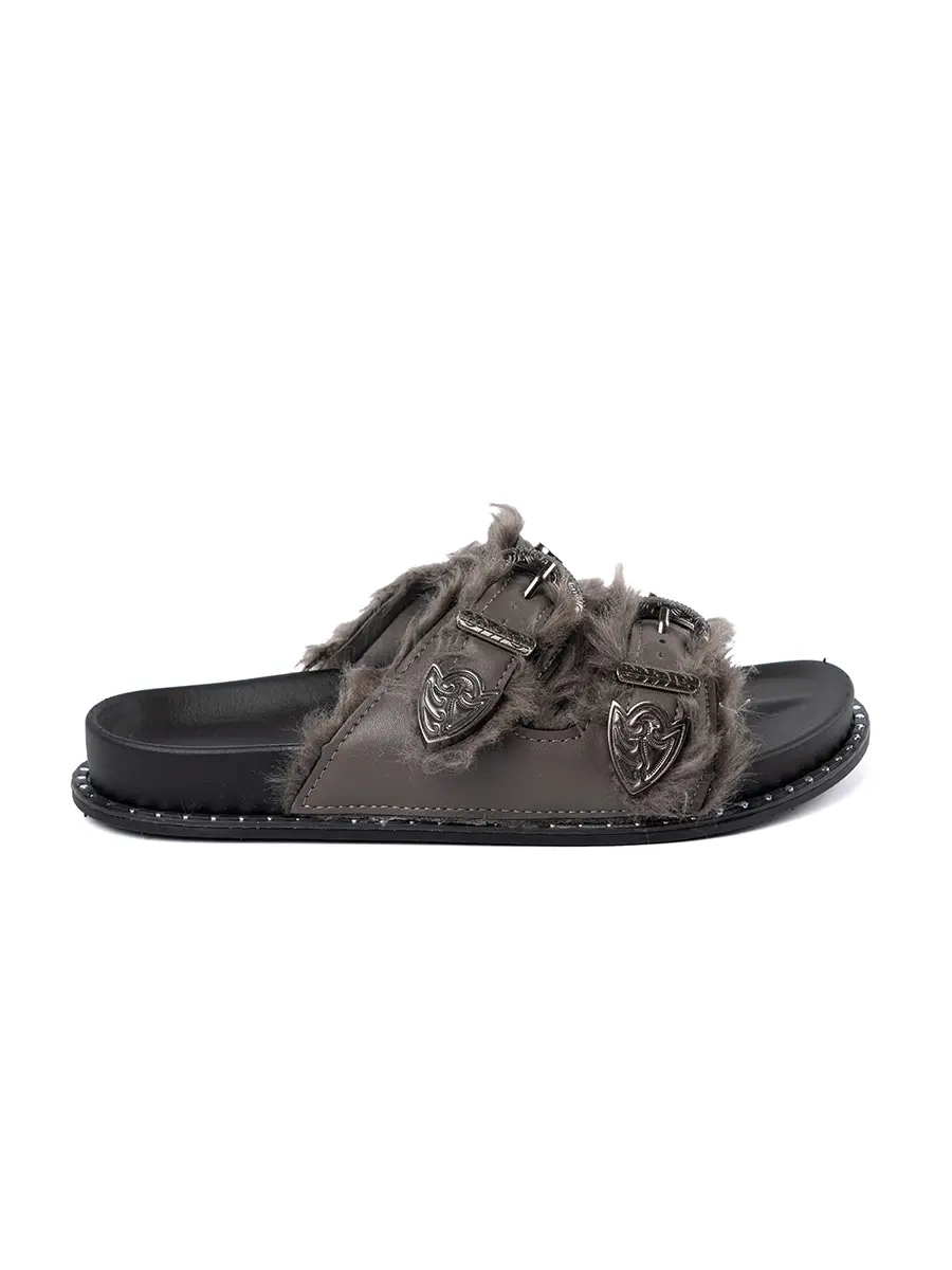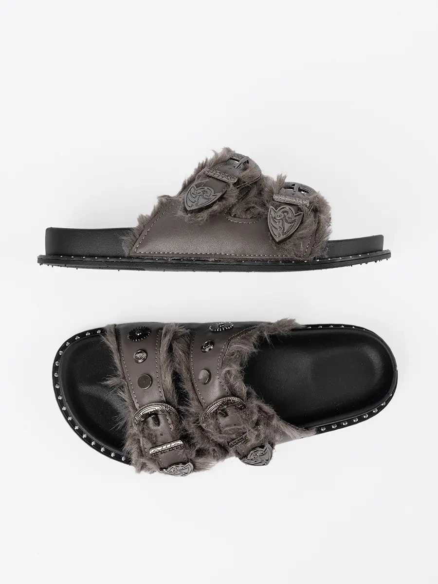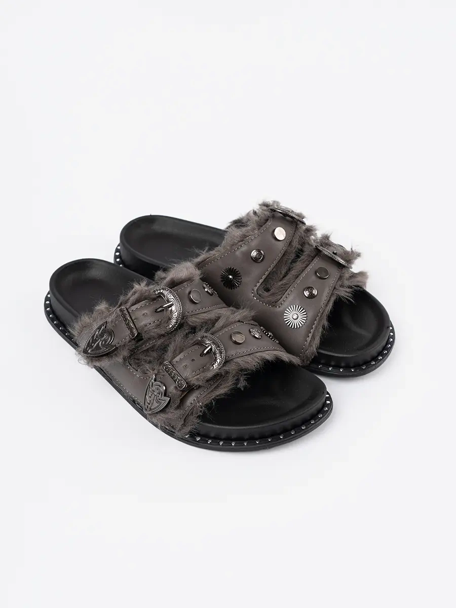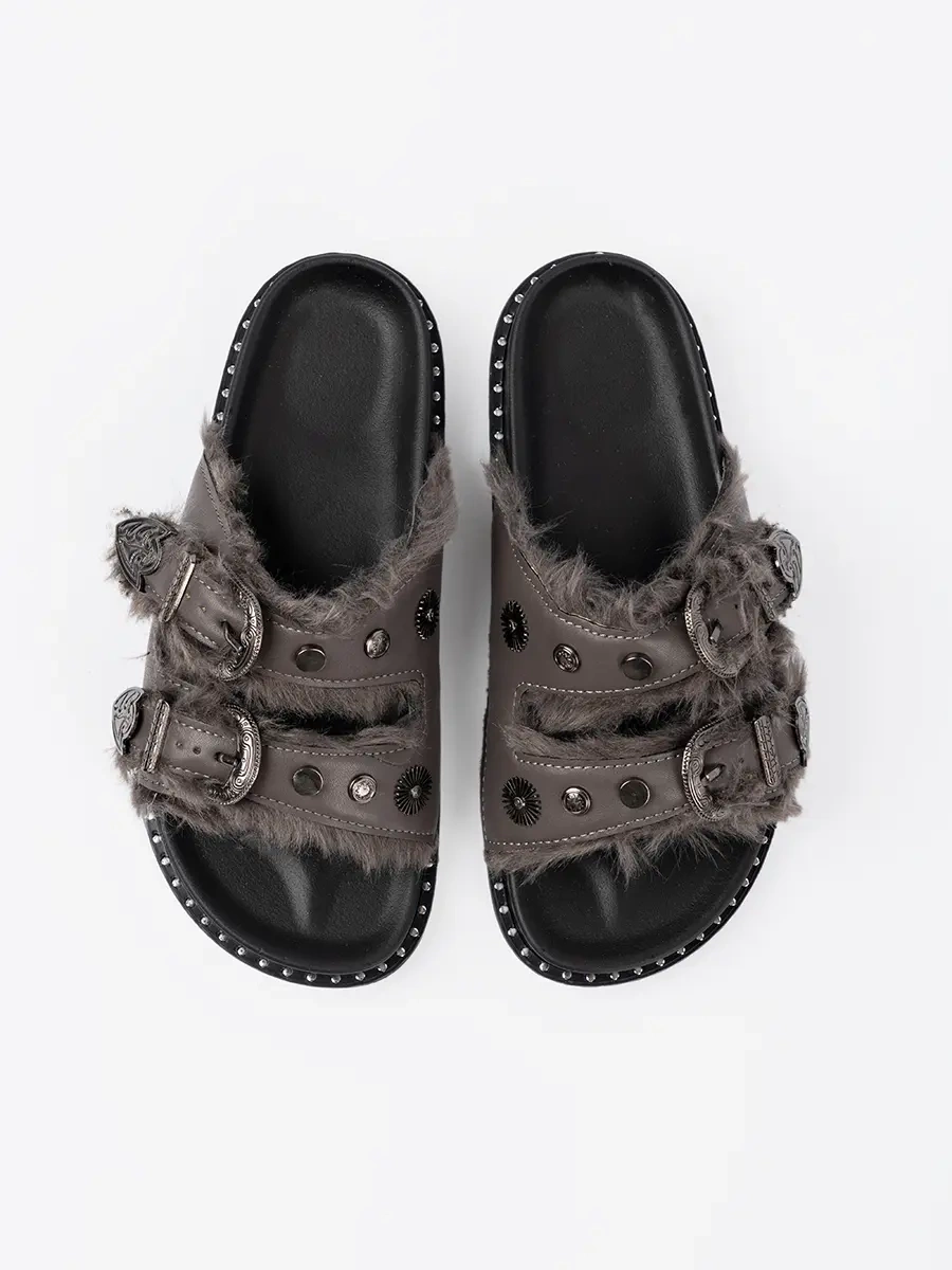 Šedé dámské klapky s kožešinou a cvočky – moderní pohodlí pro každý den