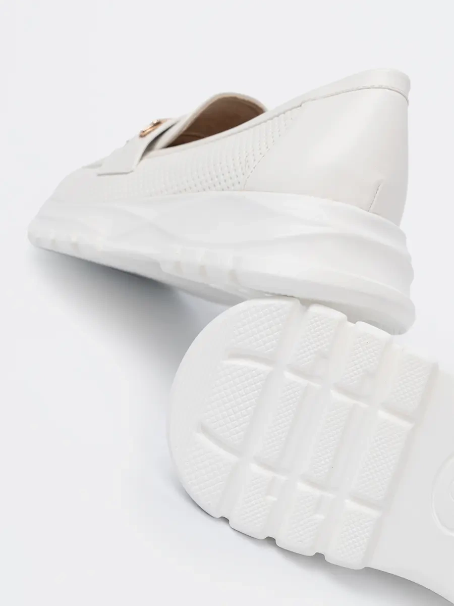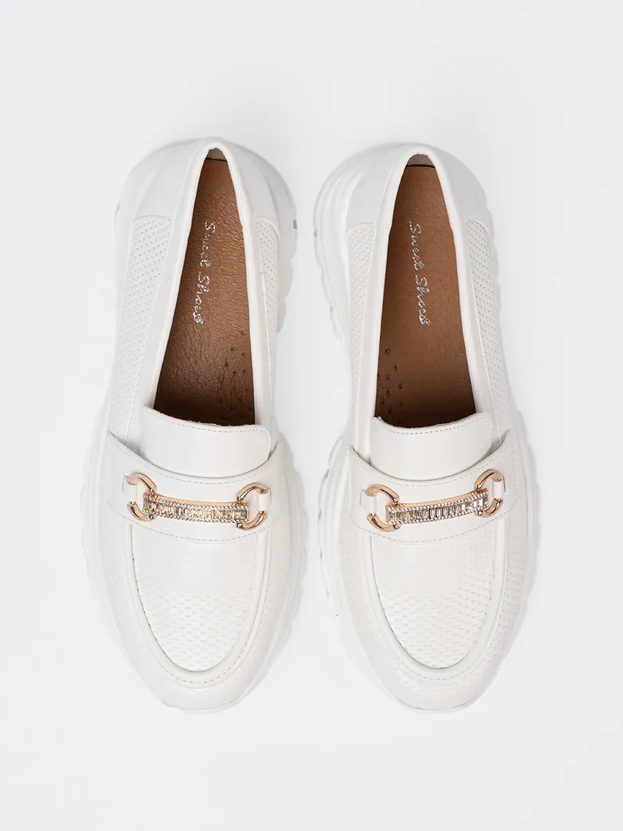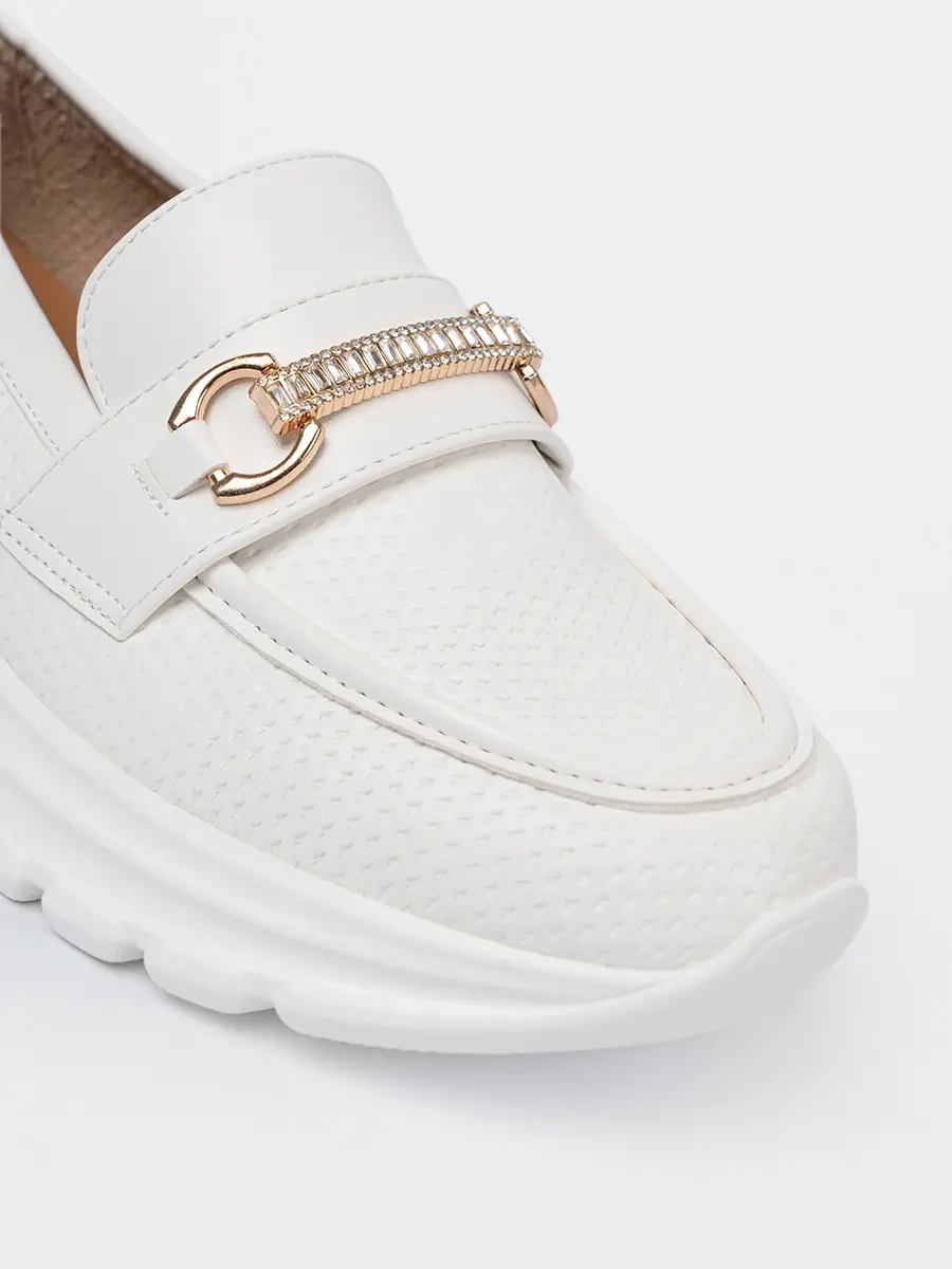 Bílé mokasíny s dekorativním zlatým prvkem – elegance a pohodlí v jednom