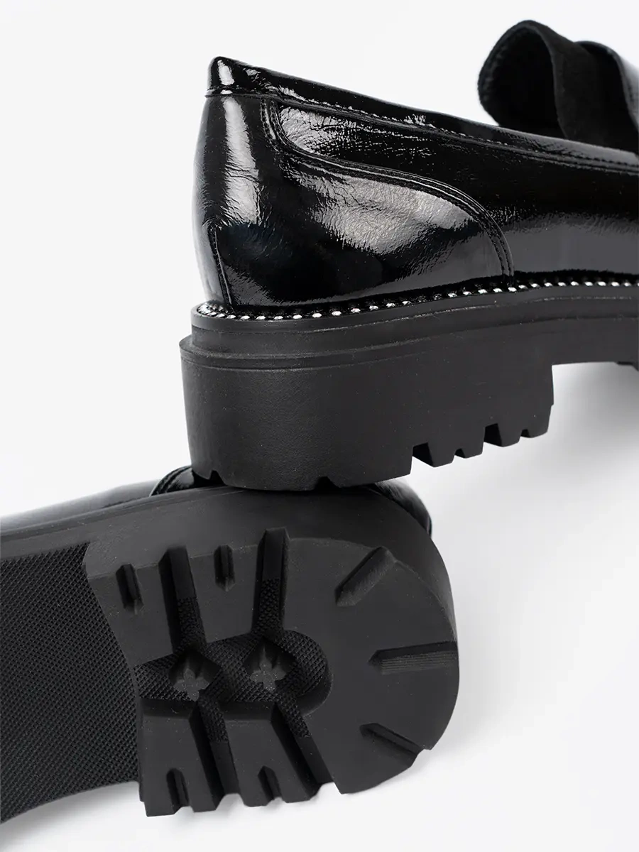 Naše lakované mokasíny na podpatku jsou určeny pro ženy, které si cení luxusu a pohodlí. Vyrobeny jsou z vysoce kvalitní ekologické lakované kůže, což jim dodává úžasný vzhled a dlouhou životnost. Elegantní černá barva jim dodává charakter a hodí se jak k elegantním, tak i casual outfitům.
