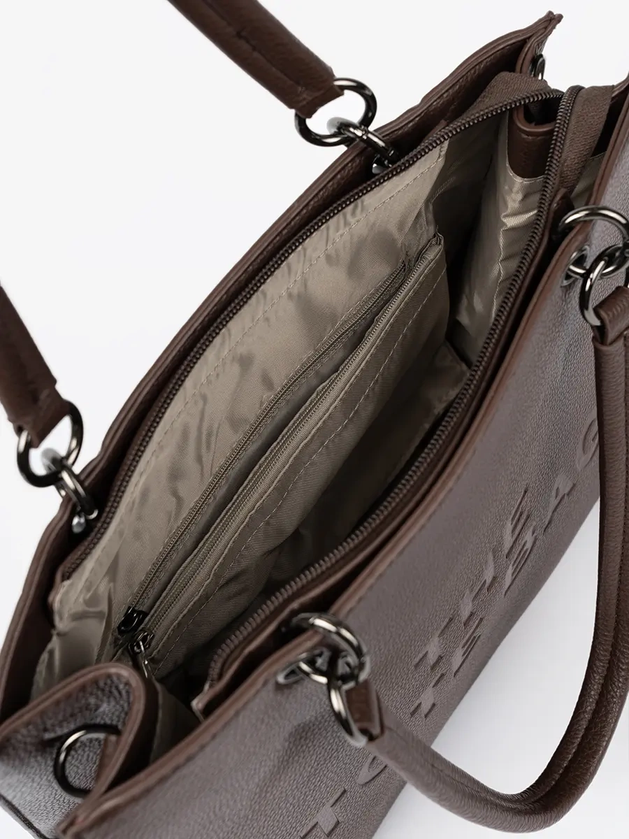 Shopperka kawowa s tłoczonym napisem je univerzální doplněk, který by měl být součástí šatníku každé moderní ženy. Je ideální pro každodenní nošení, do práce, na nákupy nebo na výlety. Snadno se kombinuje s různými styly oblečení a dodává outfitu ten správný šmrnc.