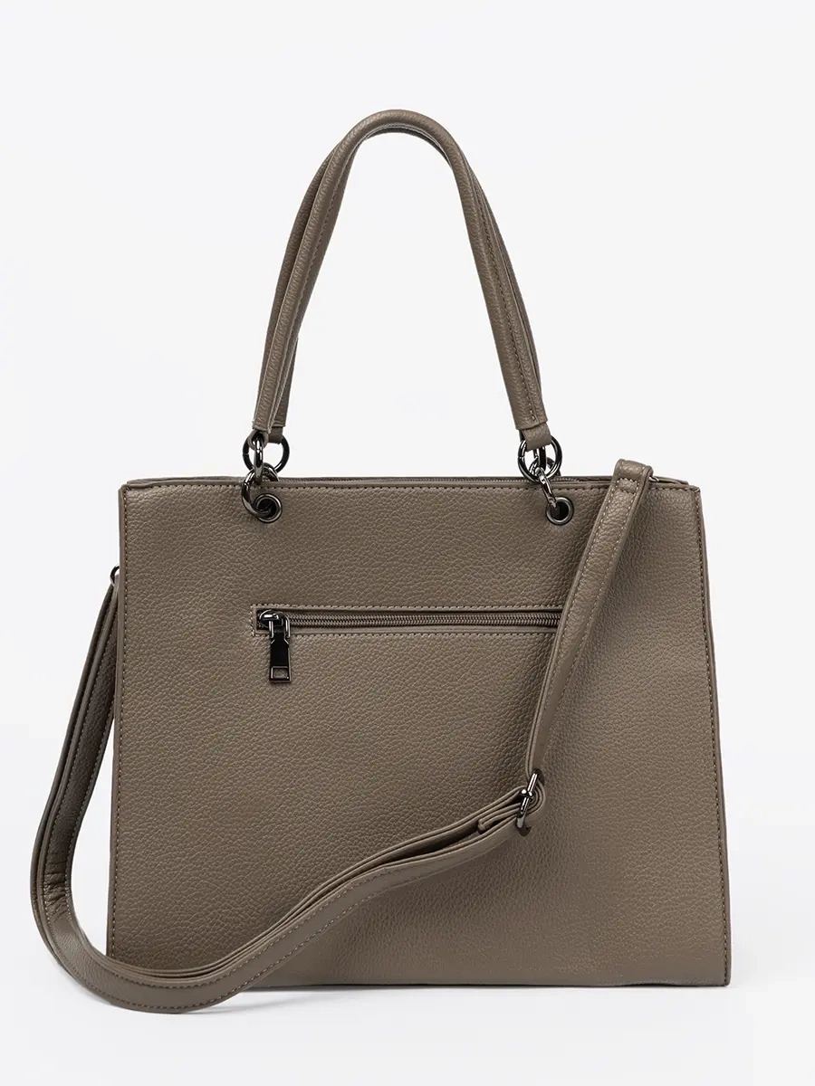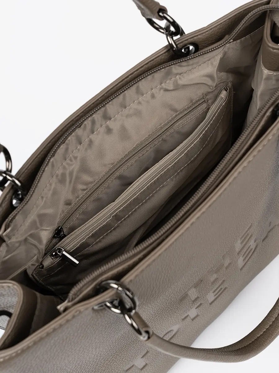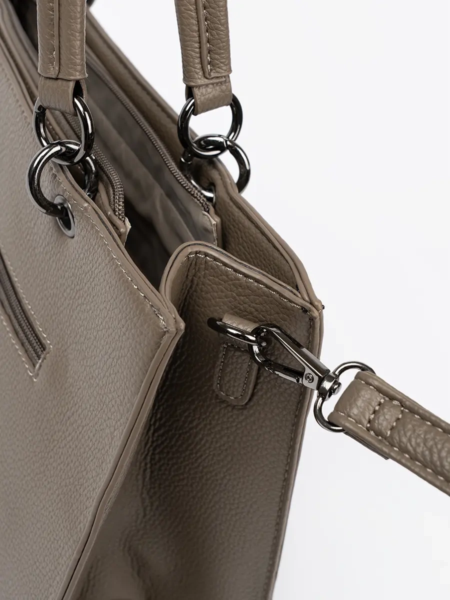 Tato fakturowaná kabelka je vyrobena z vysoce kvalitní ekologické kůže v elegantní tmavě béžové barvě. Její jedinečný design s designerským akcentem ji odlišuje od běžných kabelek a dodává jí moderní a luxusní vzhled. Kabelka je vybavena stříbrnými kovovými detaily, které dokreslují její sofistikovaný vzhled.