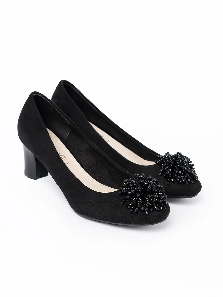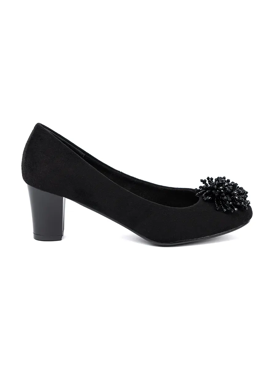 Představujeme Vám tyto nádherné černé lodičky, které jsou vrcholem elegance a pohodlí. S úchvatnou ozdobnou broží z korálků, která dodává tomuto klasickému modelu šmrnc, se stanou nepostradatelným doplňkem Vašeho šatníku.
