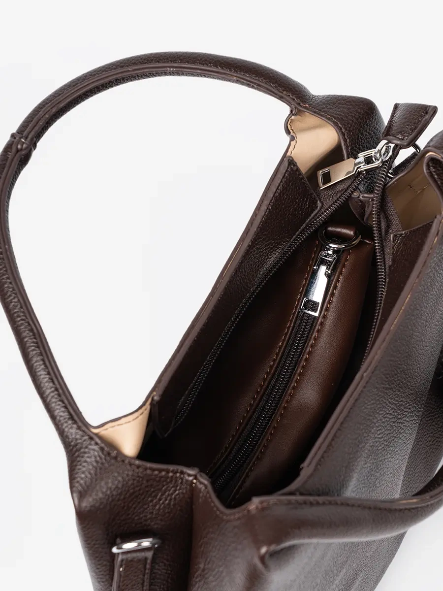 Tato kabelka je vyrobena z vysoce kvalitní ekologické kůže, která nejen že vypadá skvěle, ale také je odolná a dlouho vydrží. Tmavě hnědý odstín dodává kabelce sofistikovaný vzhled, který se hodí jak k elegantním, tak i k casual outfitům. Detaily v srebrném odstínu dodávají celkovému designu šmrnc a moderní nádech.