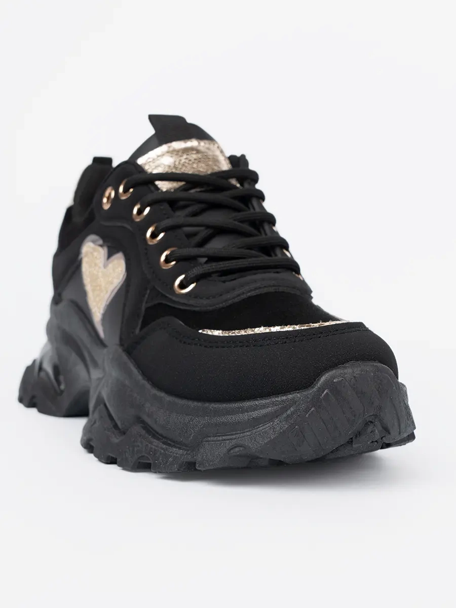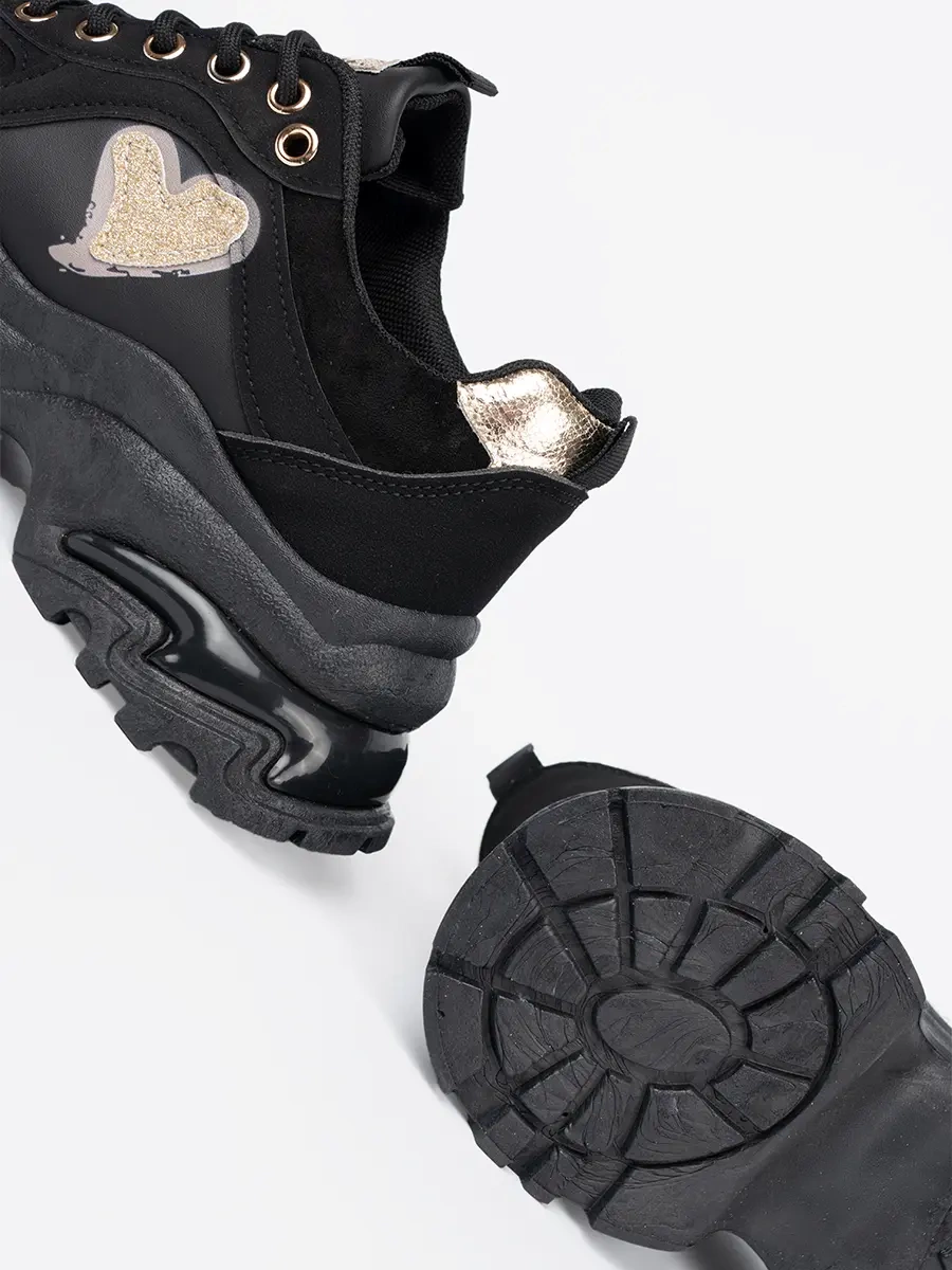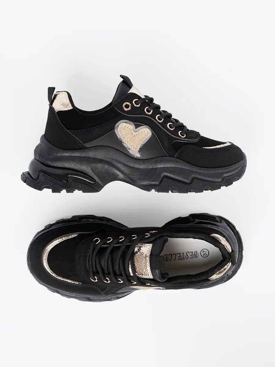 Černé sneakersy s ozdobným zlatým srdcem – módní trend pro všechny roční období