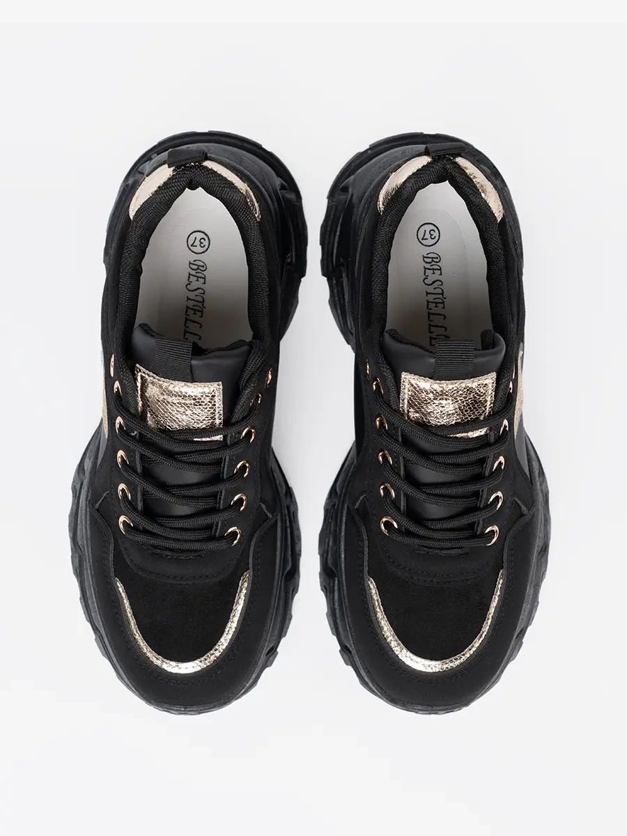 Černé sneakersy s ozdobným zlatým srdcem jsou navrženy s ohledem na maximální pohodlí při každodenním nošení. Vysoká platforma zaručuje jistý krok a zmírňuje nárazy při chůzi. Skvěle padnou na nohu díky šněrování a měkkému zapiětku. Pohodlná stélka z ekologické kůže zase poskytuje potřebnou oporu a komfort.