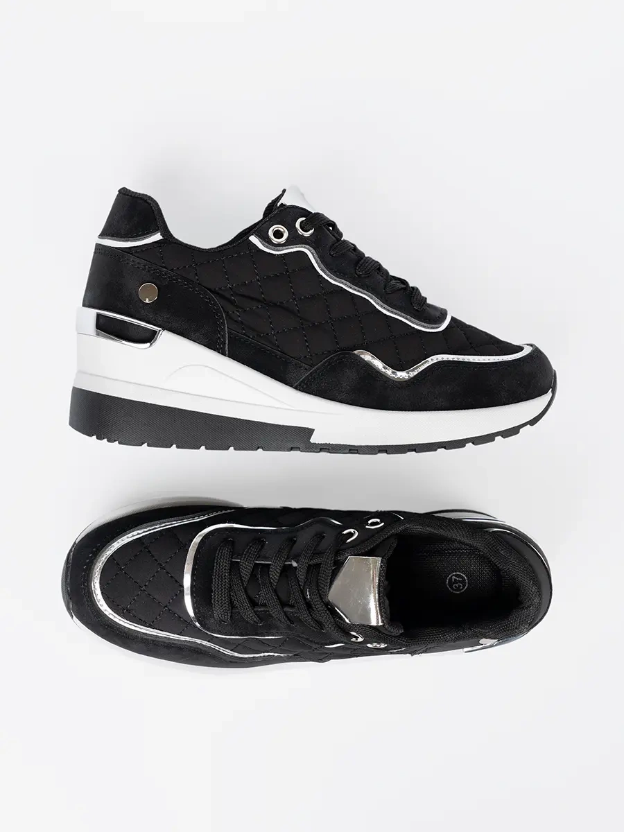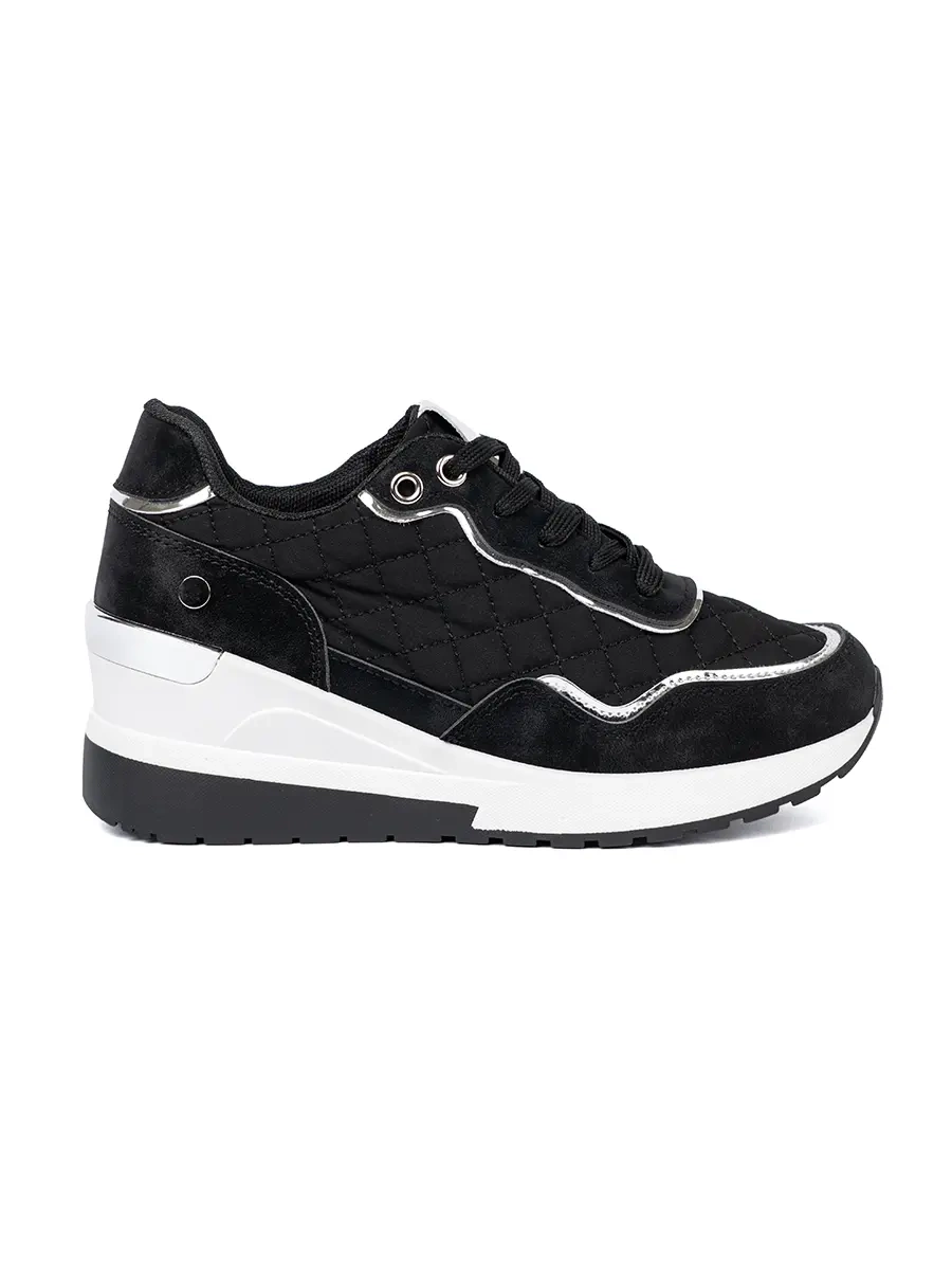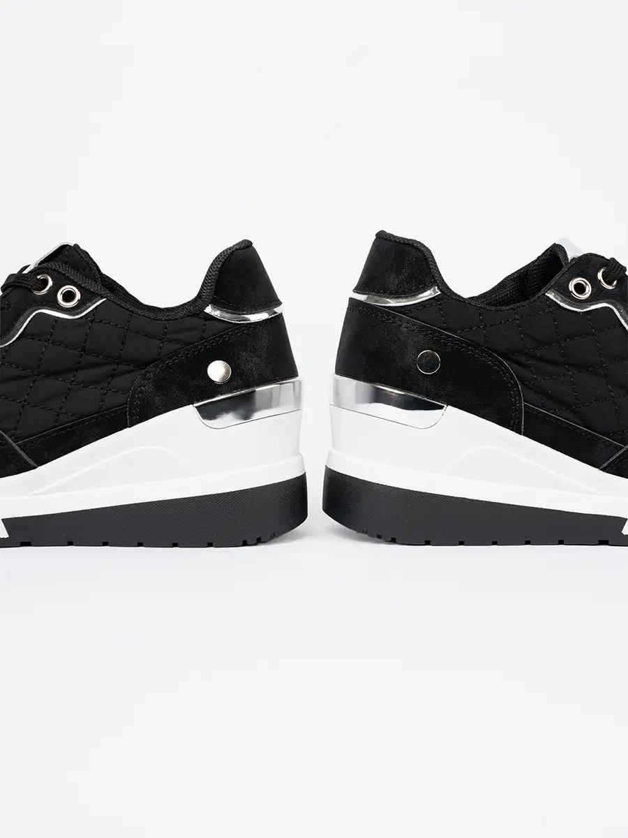 Tyto sneakersy jsou vyrobeny z kombinace kvalitní imitace kůže a textilu, které dodávají botám elegantní vzhled. Černá barva je univerzální a snadno se kombinuje s různými outfity. Díky koturnovému podpatku získáte na výšce, aniž byste obětovaly pohodlí.