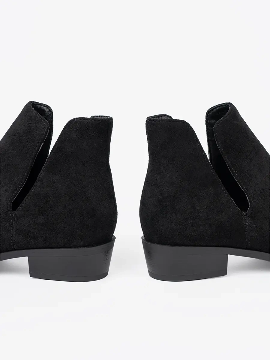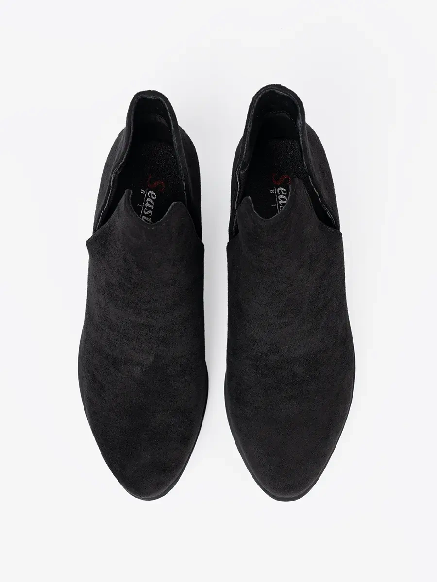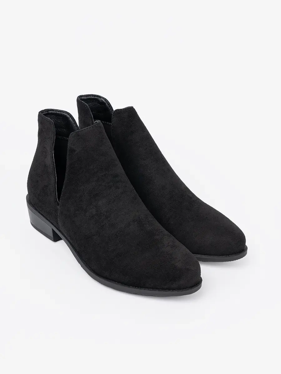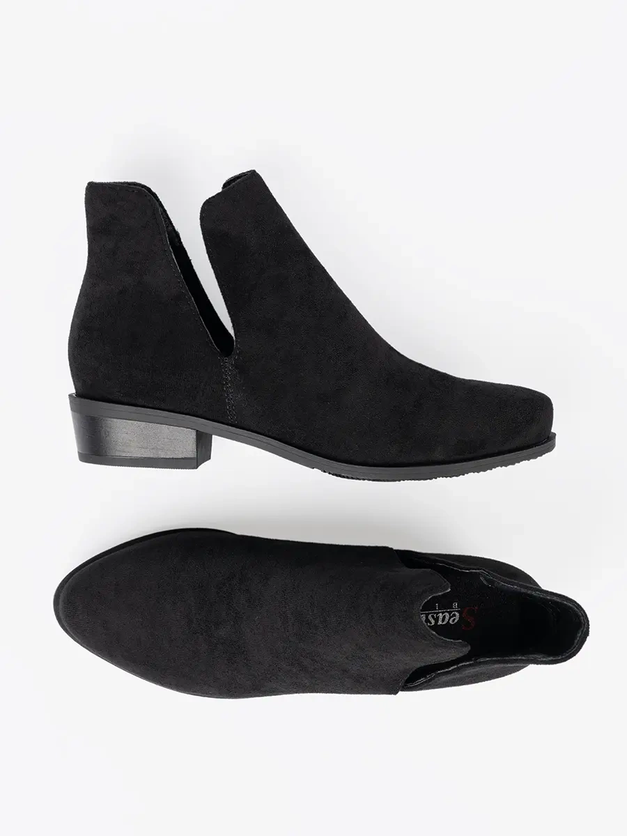 Tyto botki představují dokonalou kombinaci elegance a moderního designu. Výrazné výřezy dodávají botám jedinečný a atraktivní vzhled, zatímco černá barva zaručuje, že se budou hodit k jakémukoliv outfitu. Jsou vyrobeny z kvalitní imitace zamszu, která vypadá skvěle a zároveň je odolná a dlouhodobě vydrží.