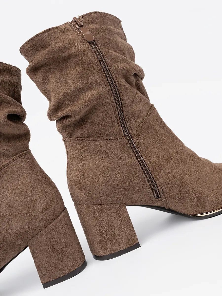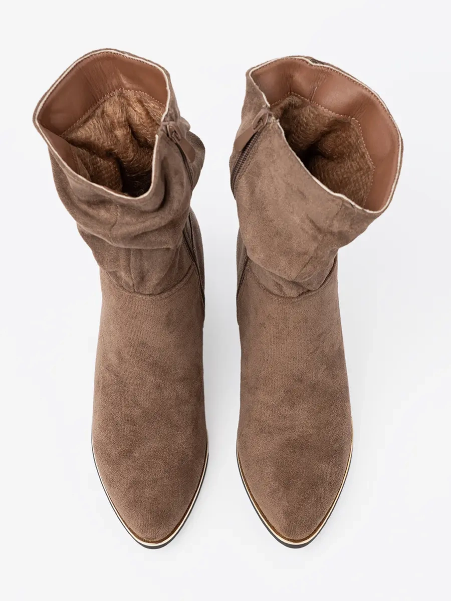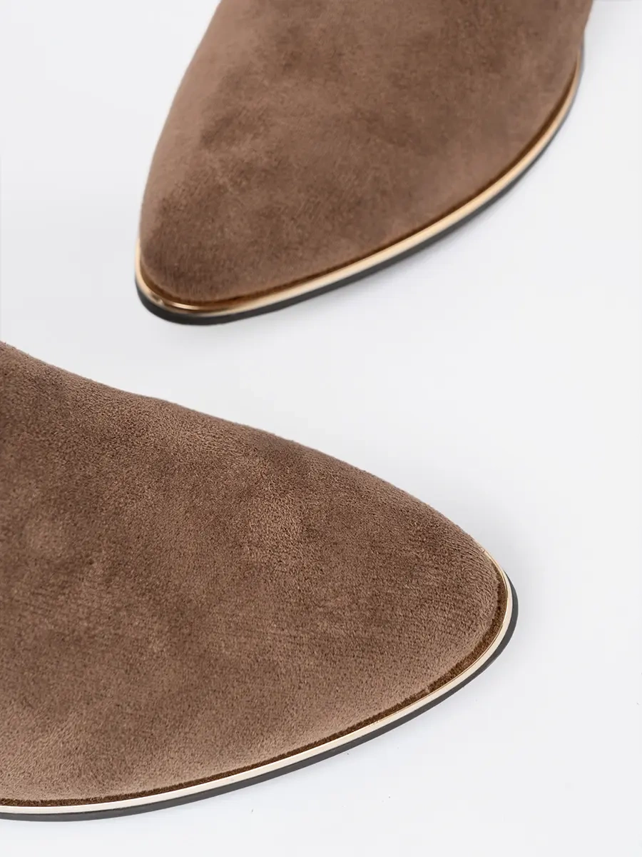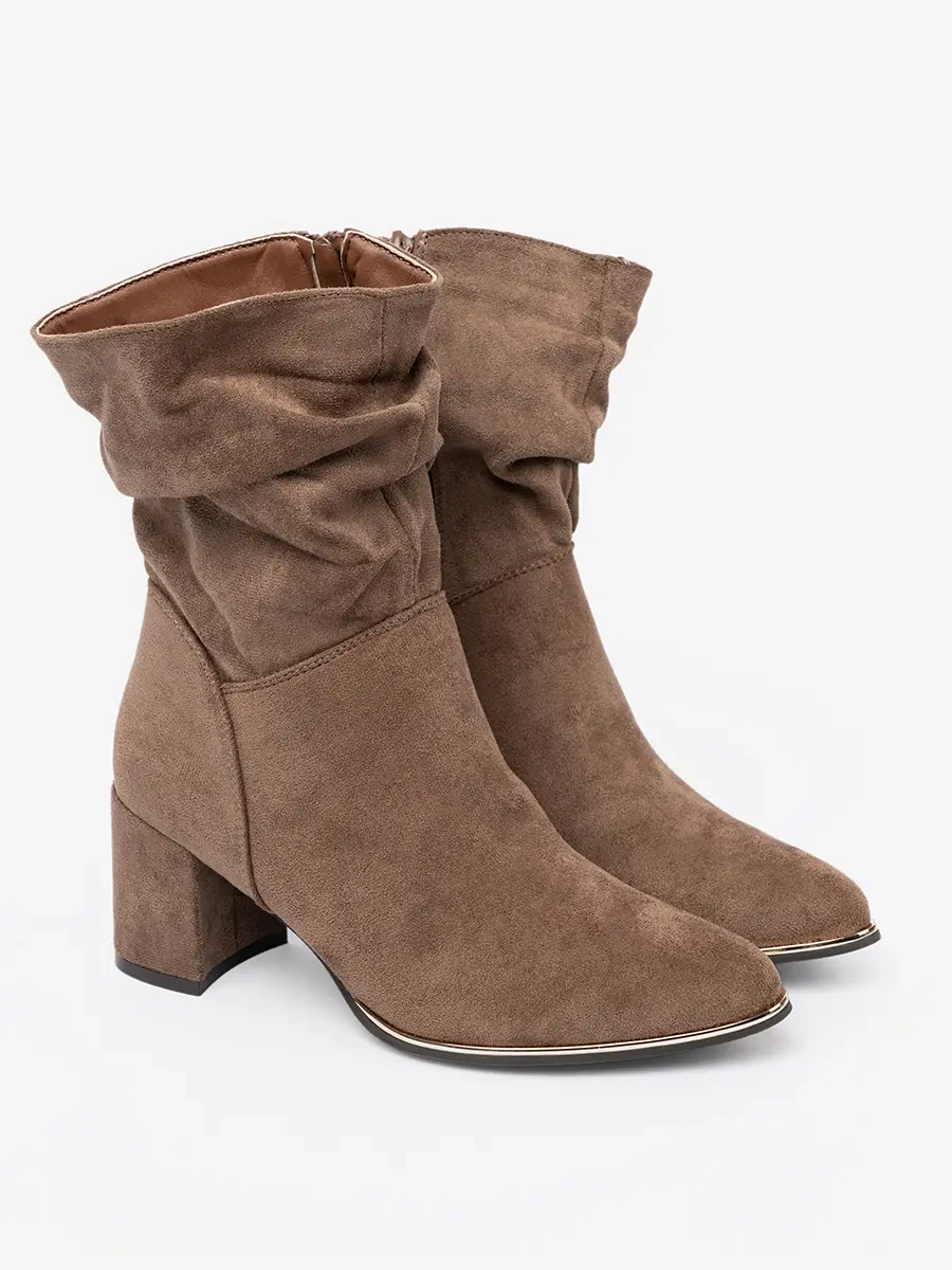 Ciemnobeżowe botki zamszowe na słupku - elegance pro každý den