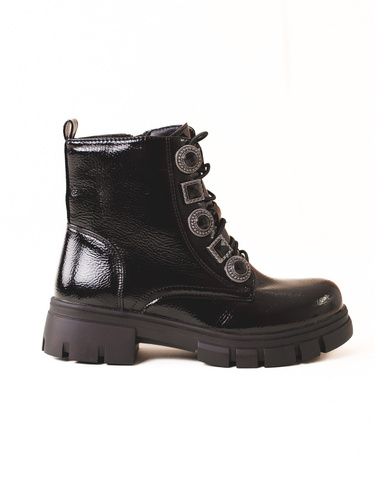 Dámské lakované kotníkové boty na plochém podpatku