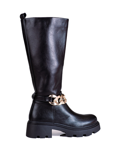 Černé dámské kozačky s řetízkem z eko kůže